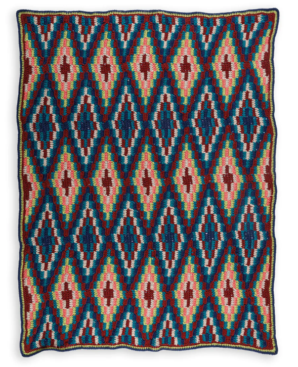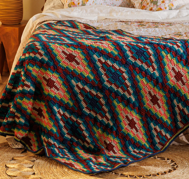 This design is worked in multiple colors to create depth and movement across the blanket. The layered diamond effect gives it a modern, almost woven appearance, making it a standout piece for your living room or bedroom. Whether you follow the original color palette or customize it with your own favorite shades, this blanket is sure to become a treasured heirloom.